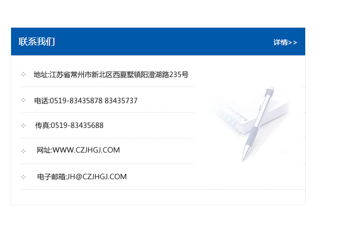 傳真:0519-83435688    郵編:213135    網址:WWW.czjhgj_com.happy-30.com    電子郵箱:JH@czjhgj_com.happy-30.com